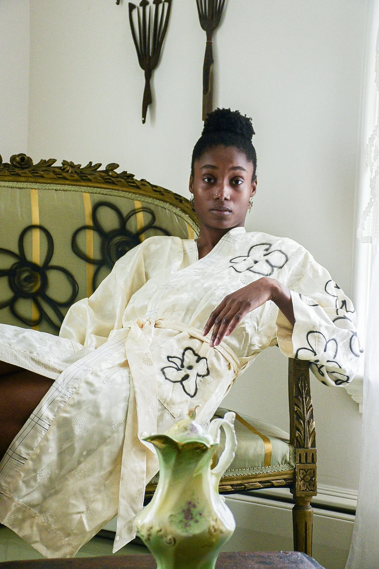 Made from airbrushed deadstock* silk, with deconstructed* design detail at collar